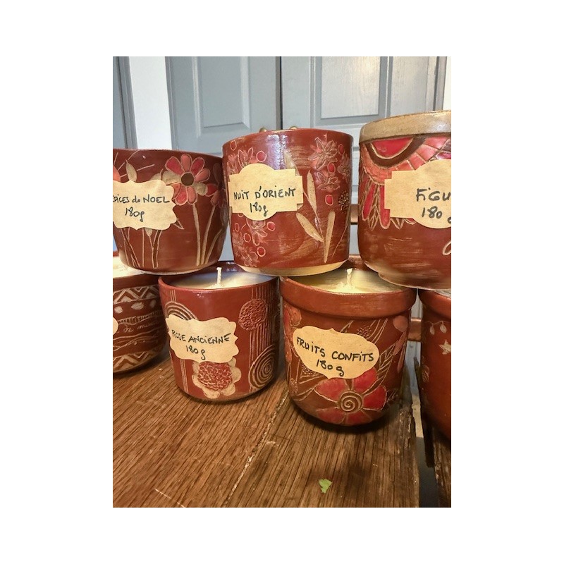 Bougie en céramique tournée et décorée à la main. Parfum « le petit Grassois » garanti sans CMR. Côte végétale vegan 180g + pochonDestinataire :